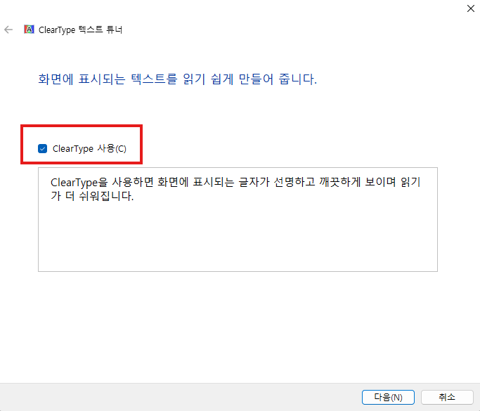 5. 설정 -> ClearType 텍스트 조정 -> ClearType 사용 체크박스 체크 -> 다음다음... -> 마침