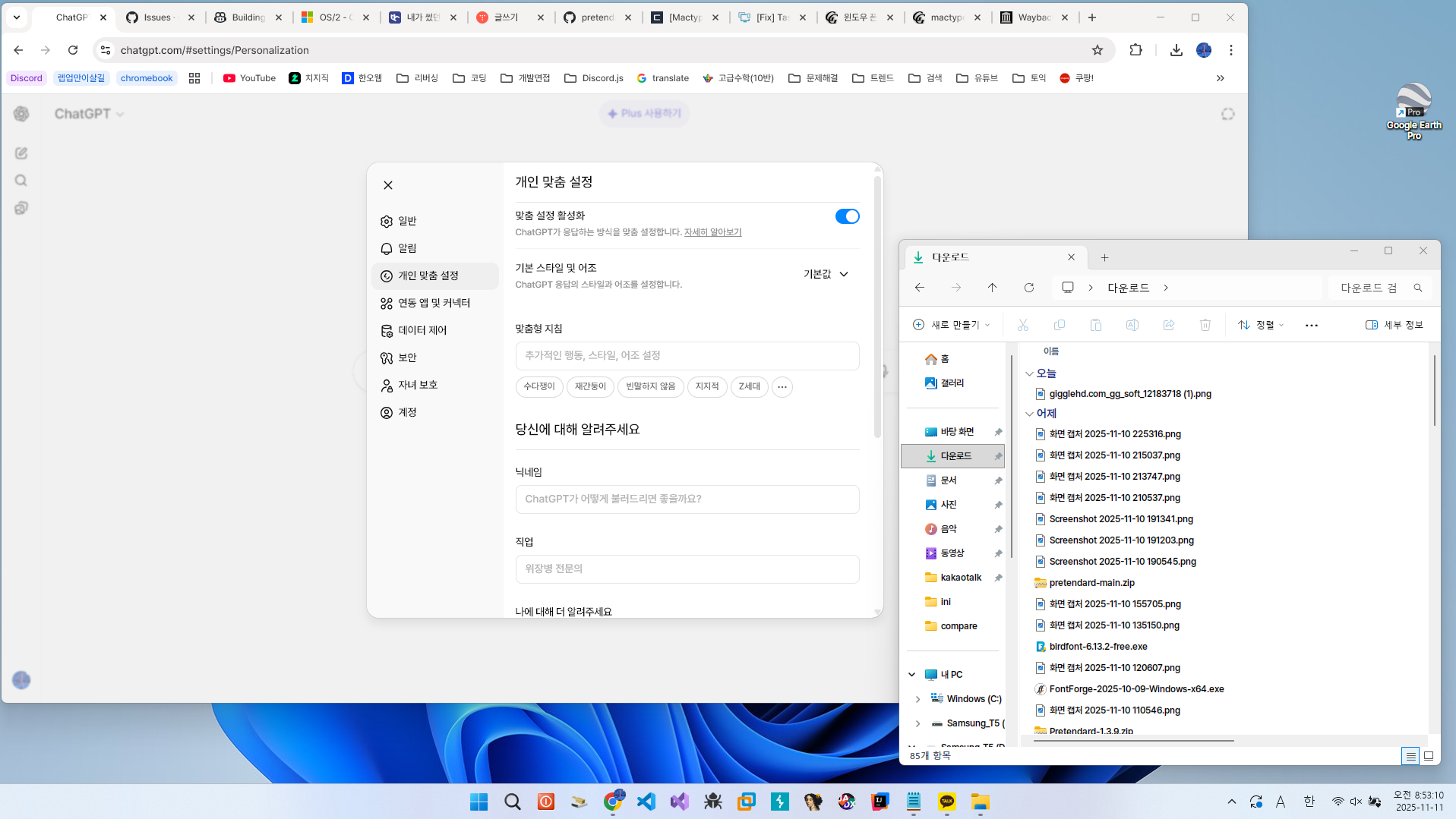 위 글을 따라하여 MacType(버전: 2025.6.9)과 noMeiryoUI(버전: 3.4.0) 프로그램을 사용하여 윈도우 운영체제의 폰트를 Pretendard JP Medium(버전: 1.3.9)으로 적용하여 아래 사진과 같이 윈도우의 폰트를 예쁘게 바꿀 수 있었습니다.