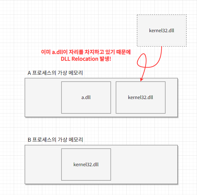 위 그림을 보면 A 프로세스에서 로드된 kernel32.dll의 주소와 B 프로세스에서 로드된 kernel32.dll의 주소가 다릅니다. DLL Relocation이 발생했기 때문이죠.