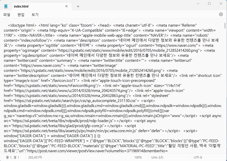 2. 네이버의 index.html 파일을 바탕화면에 다운로드