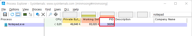 우선 메모장을 실행하고, Process Explorer(또는 작업 관리자)로 메모장의 PID를 확인해 줍니다.