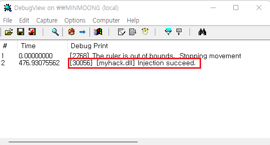 그럼 myhack.dll에서 OutputDebugString() 함수로 출력하는 내용을 확인해 보겠습니다.