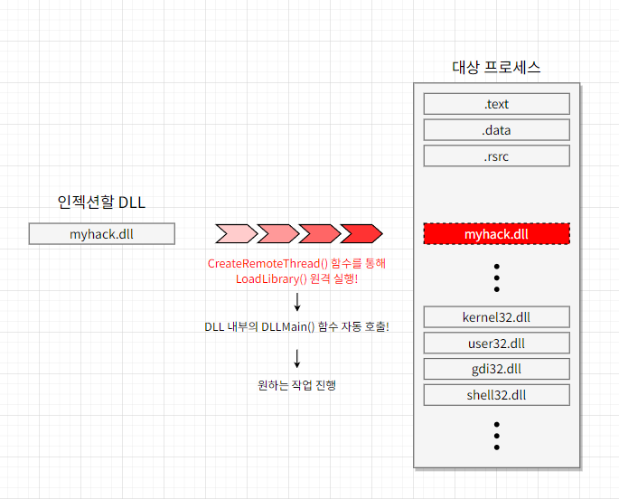 DLL 라이브러리를 로드할 때 쓰이는 LoadLibrary() 함수를 대상 프로세스가 실행하도록 하여 DLL을 로드시키는 원리입니다.