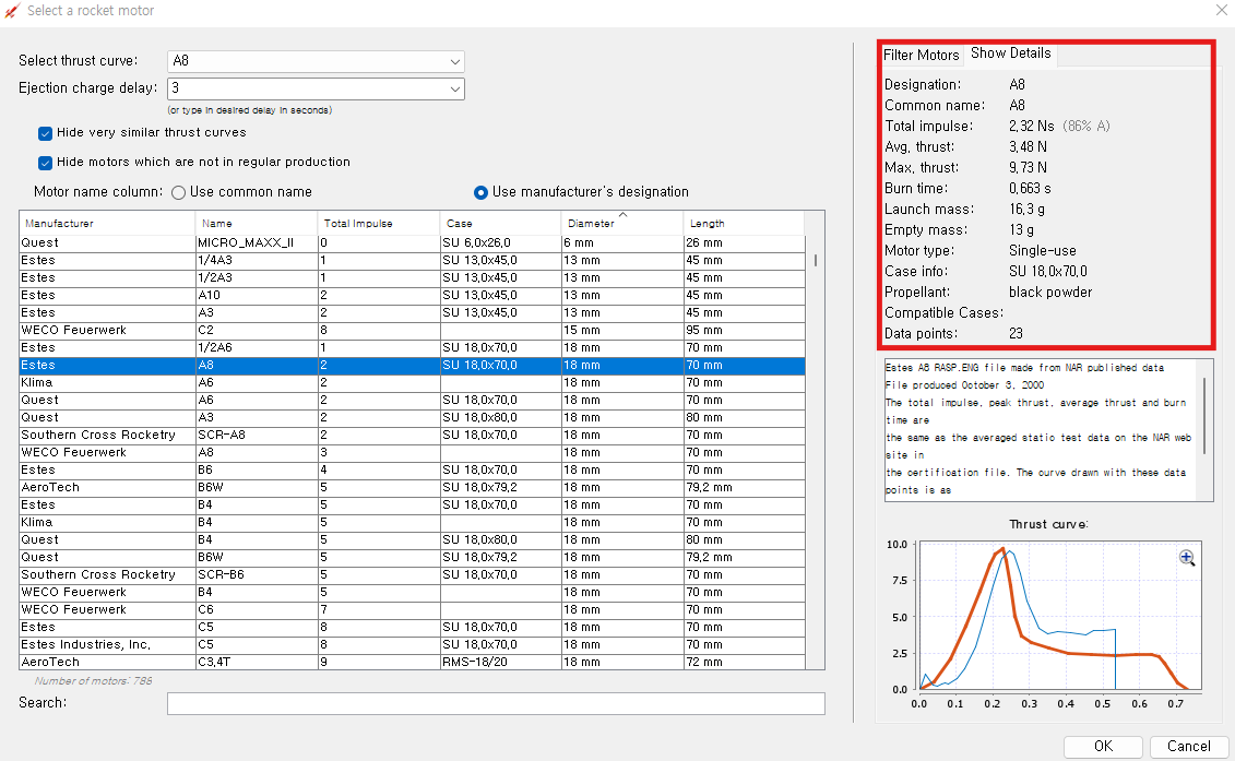 위와 같이 선택하고 싶은 엔진의 유형(위의 경우에 A8-3)을 클릭하고 'Select motor' 버튼을 누르면 A8-3 유형에 해당하는 엔진들이 다 나옵니다.